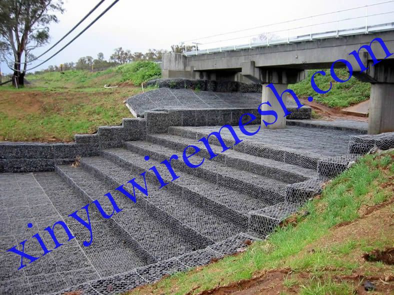 石籠網(wǎng)是由高抗腐蝕、高強(qiáng)度、具有延展性的低碳鋼絲或者包覆PVC的以上鋼絲使用機(jī)械編織而成,根據(jù)ASTM A 975和EN10223標(biāo)準(zhǔn),所使用的低碳鋼絲直徑根據(jù)工程設(shè)計(jì)要求而不同。一般介于2.0-4.0mm之間,鋼絲的抗拉強(qiáng)度不少于38kg/m2,金屬鍍層重量一般高于245g/m2石籠網(wǎng)片的邊緣線直徑一般要大于網(wǎng)線直徑。其雙線絞合部分的長度不得小于50mm.以保證絞合部分鋼絲的金屬鍍層和PVC鍍層不受破壞。