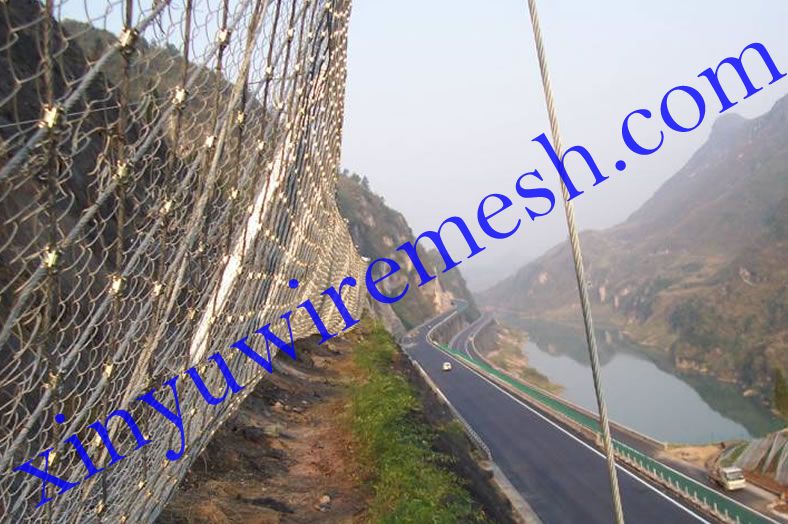 被動防護是由鋼絲繩網、環(huán)形網、(需攔截小塊落石時附加一層鐵絲格柵)、固定系統(tǒng)(錨桿、拉錨繩、基座和支撐繩)減壓環(huán)和鋼柱四個主要部分構成。鋼柱和鋼絲繩網連接組合構成一個整體,對所防護的區(qū)域形成面防護,從而阻止崩塌巖石土體的下墜,起到邊坡防護作用。