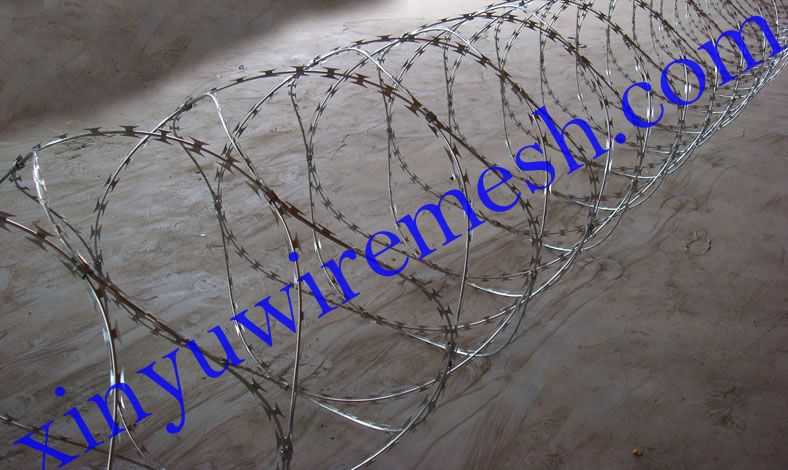 蛇腹型刀片刺網(wǎng)又名刀片刺網(wǎng)或刮刀型刺網(wǎng),是一種近年來防護、隔離能力較強的新型產(chǎn)品。刀片刺網(wǎng)用及耐腐蝕性的熱鍍鋅鋼板或不銹鋼板做材料,由專用機械強力包附與熱鍍鋅高碳鋼絲或不銹鋼絲做的芯線上。由于有著鋒利美觀的刀片刺、高強度的芯線,使本產(chǎn)品綜合了防阻效果好、難破壞、安裝美觀方便快捷、耐老化等諸多優(yōu)點。