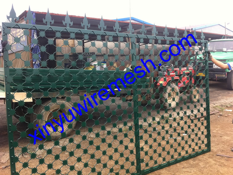 梅花刺片防逃網(wǎng)是由美格網(wǎng)和梅花刺片和框架組成。用氬弧焊將梅花形刺片焊接在美格網(wǎng)的節(jié)點上,形成刺形保護,有效的防止了手握腳攀,是監(jiān)獄和看守必用防護設(shè)施。