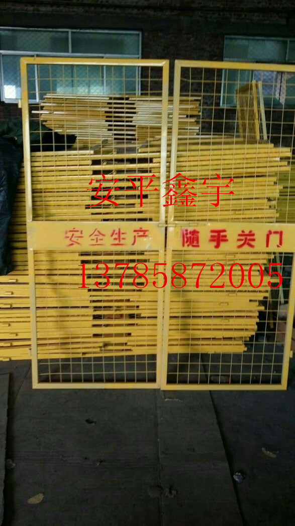 電梯防護門全部由鋼結構組成。鋼材采用國家標準材料,制作嚴格按圖施工,尺寸正確,焊接點牢固,達到安全防護之目的,電梯安全門采用檸檬黃色,門下部檔架板采用黃、黑間隔。