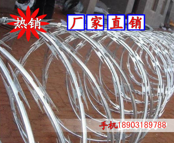 刀片刺網(wǎng):是刀片刺繩的一種新的應(yīng)用方式,它是將單圈式刀片刺繩平壓成板狀,或?qū)杉稳Φ镀汤K壓平后交叉相錯使用,外表美觀而且實用,可與直線型刀片刺繩搭配使用,構(gòu)成下直線上平板的防護墻,或僅用平鋪型刀片刺繩構(gòu)成防護墻。