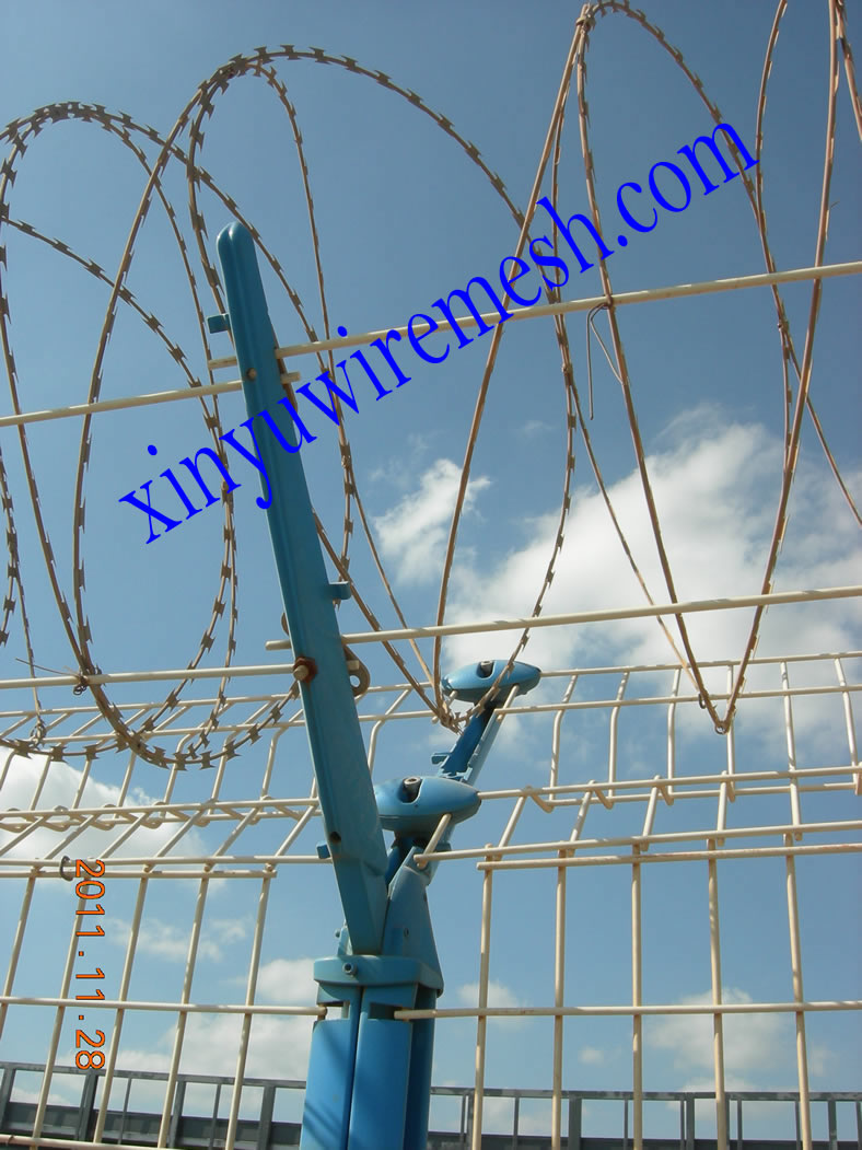 機(jī)場(chǎng)護(hù)欄網(wǎng)又稱作“Y型安全防御護(hù)網(wǎng)”,是由V型支架立柱加強(qiáng)型焊接片網(wǎng),安全防盜連接件和熱鍍鋅刀片刺網(wǎng)組成強(qiáng)度和安全防御性級(jí)別很高。近年來被廣泛應(yīng)用在機(jī)場(chǎng),軍事基地等高安全場(chǎng)所。 注:如果在機(jī)場(chǎng)護(hù)欄網(wǎng)頂部加裝刀片刺絲、刀片刺網(wǎng)后又很好的增強(qiáng)了安全防護(hù)性能。采用電鍍、熱鍍、噴塑、浸塑等防腐形式,具有很好的抗老化、抗曬、耐腐蝕等特點(diǎn)。其產(chǎn)品造型美觀、花色多樣,既起到圍欄作用,又起到美化作用。由于具有安全性高、防攀爬能力好,網(wǎng)片連接方式采用特制SBS緊扣件,有效防止人為的破壞性拆卸,橫向四道折彎加強(qiáng)筋,使網(wǎng)面強(qiáng)度顯著增加。